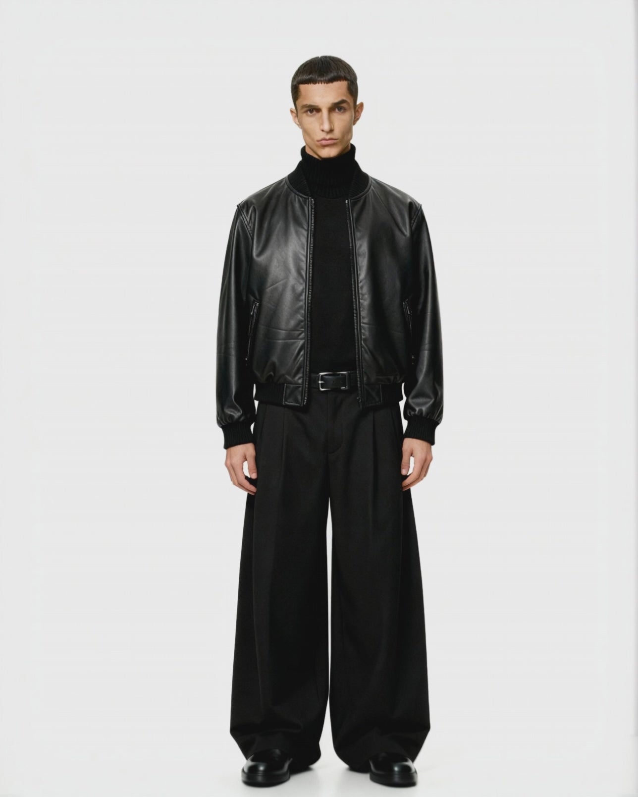 Smooth and elegantly structured, the jacket features a sleek front zipper and two discreet pockets that enhance its contemporary silhouette. Its supple texture and sophisticated finish evoke the richness of traditional leather—yet without the use of any animal materials.